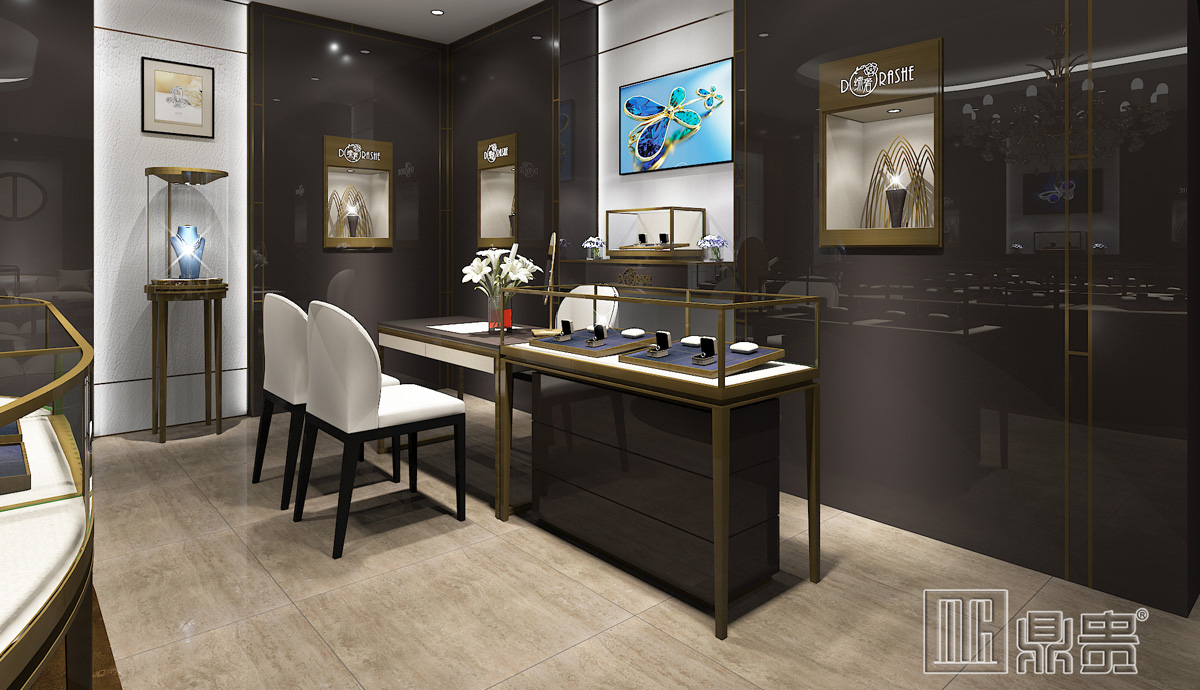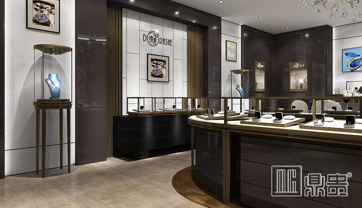 山东淄博高端珠宝店空间设计主要以经典的灰白色调为主。灰白色的搭配视觉冲击力强,对比性比较鲜明,很能吸引顾客的注意力。拉丝青古铜与灰色烤漆的组合大气高端,灰色块穿插在各具造型的内部空间,将整个店铺空间联系起来成为一个整体,实现象征性的统一,增添了神秘高端的感觉。整个空间造型简单大气,陈列丰富但又不失精致高端富有美感的展示,更切合品牌需求。