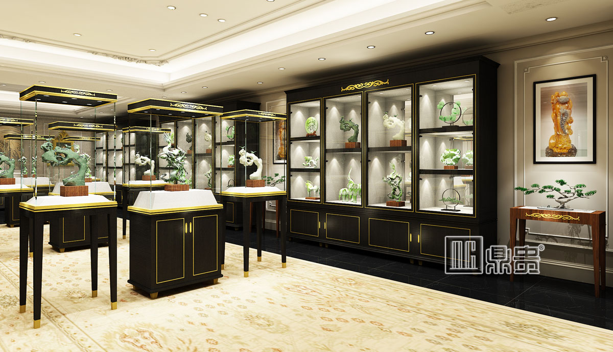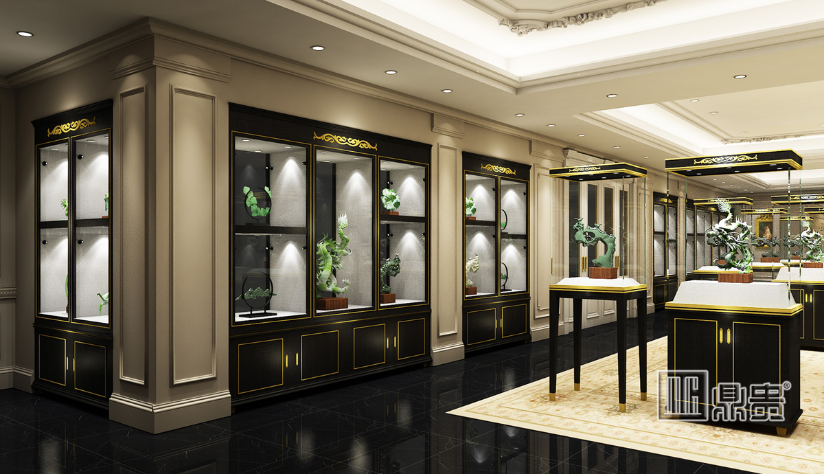 本项目玉器展厅、坐落于美国迈克,占地面积约200平方米。展厅内主要展示大型玉器摆件等。整体参考欧式新古典风格设计、运用欧式雕花及角线装饰为了更好的凸显新古典,白色的天花加上简约的造型让空间变得舒适,金色直线条给柜体添加了活力。层板增加射灯可以让灯光聚焦在产品之上、侧板的灯条作为辅助照明。精品柜合理的运用金色和黑色木纹的搭配更引人注目。在外墙柱子上运用简单的线条、加顶部的角线衔接天花,构成室内华美厚重的气氛,营造典雅、自然、高贵的气质。