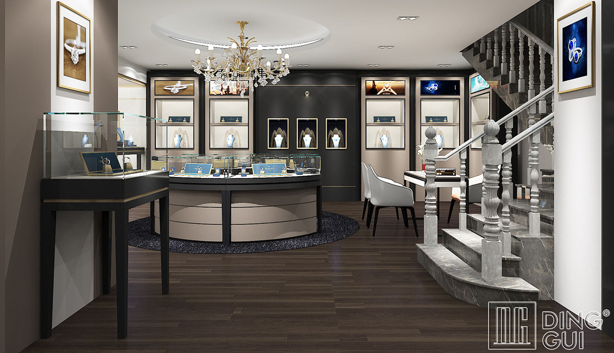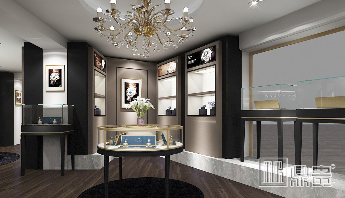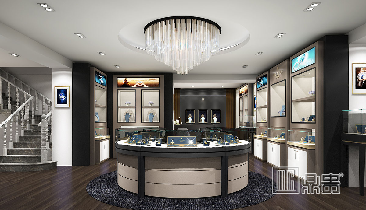 此项目为英国的一个高端珠宝店铺。整个空间以简洁的手法,诠释珠宝店的高贵奢华的气质。橱窗的设计是此空间的一个亮点,高端大气的橱窗贯穿店铺主人流的墙面上,跨度长且通透的设计可以让消费者经过店铺时有一段距离时间的思考和品牌形象的输入,最终达到吸引顾客的目的。入墙式展柜的设计很好的与整个环境融为一体,给人一种极致奢享的感觉,灰色烤漆搭配不锈钢香槟金,让整体的氛围更加高端、突显品味。细节处香槟金的融入无不衬托珠宝的尊贵和雅致。