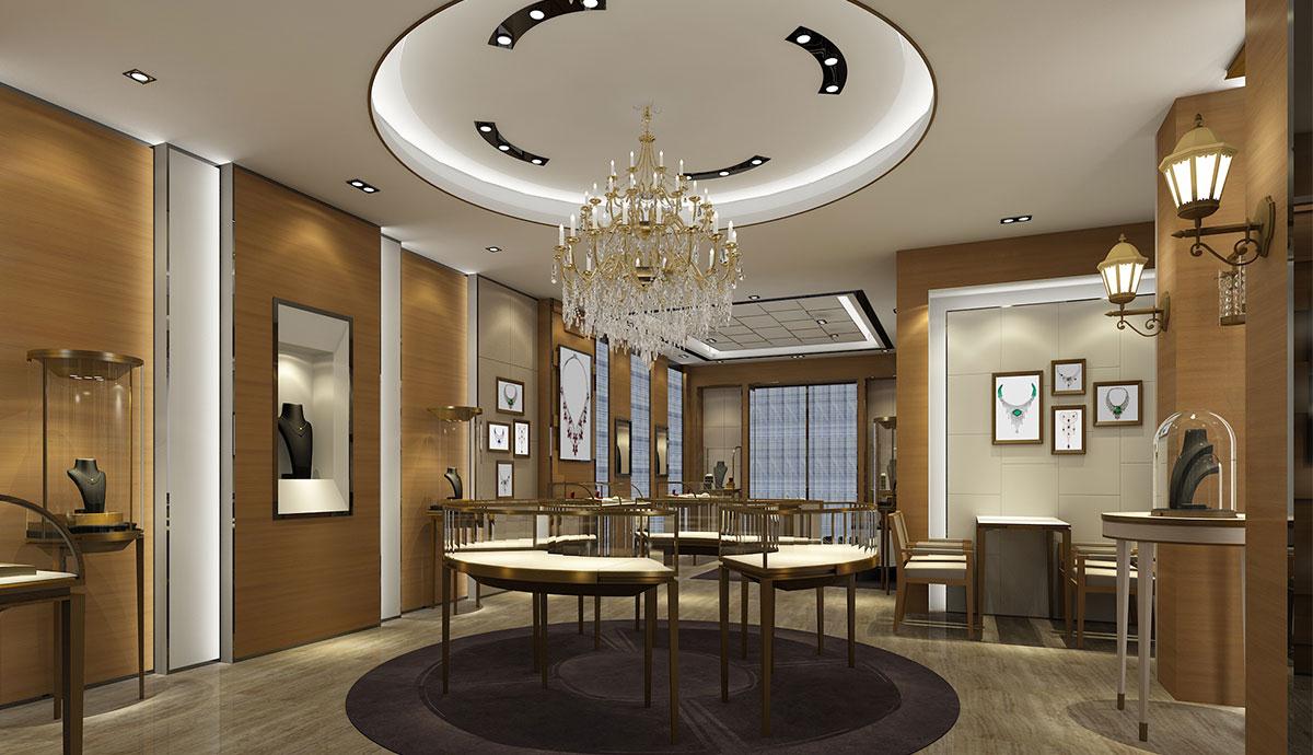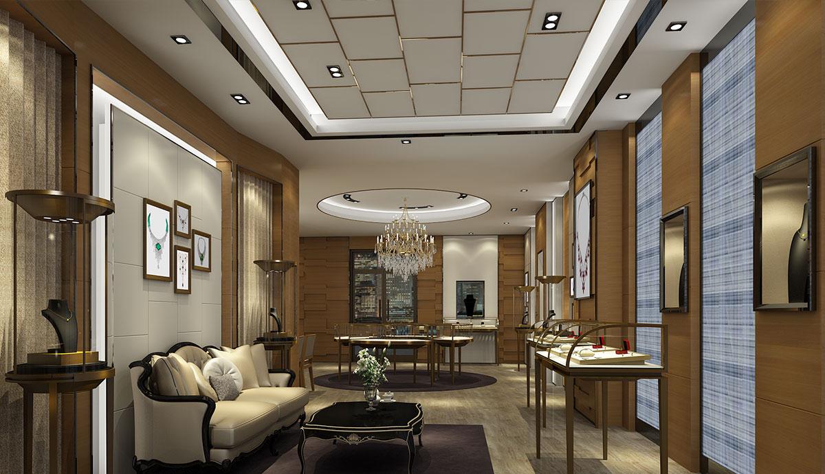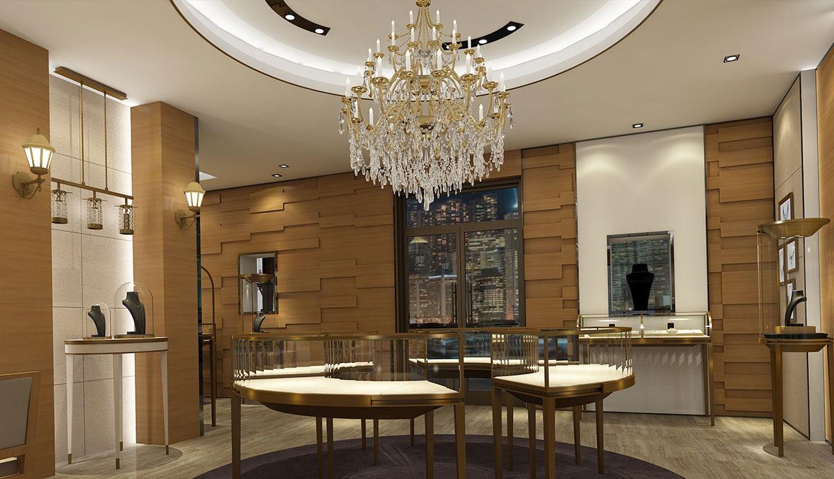 此项目位于阿联酋的金融中心迪拜,在繁华的商业中心我们试图用大面积的木色使得冷漠的空间有一定的温度,让消费者更愿意进店体验。精心设计的不规则的块面去装饰墙面,细节的加入壁灯,极富阿拉伯式美学。在店内装饰上没有复杂的道具,没有过多的去装饰空间。用木质结合简洁的金属装饰线条打造出一个简洁又不失细节的奢华空间,这样的空间设计风格既符合工装简单利索的风格又使整个店面充满奢华的设计感。中间奢华的水晶吊灯搭配各式的灯光组合更能烘托店内昂贵珠宝的璀璨。