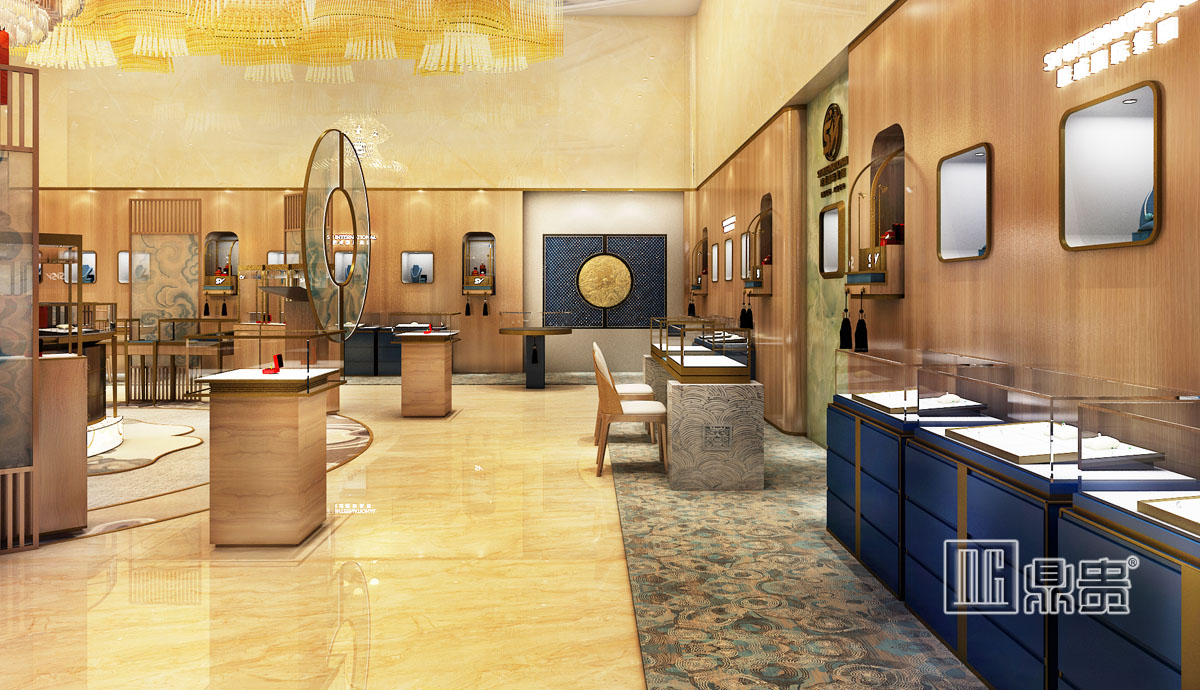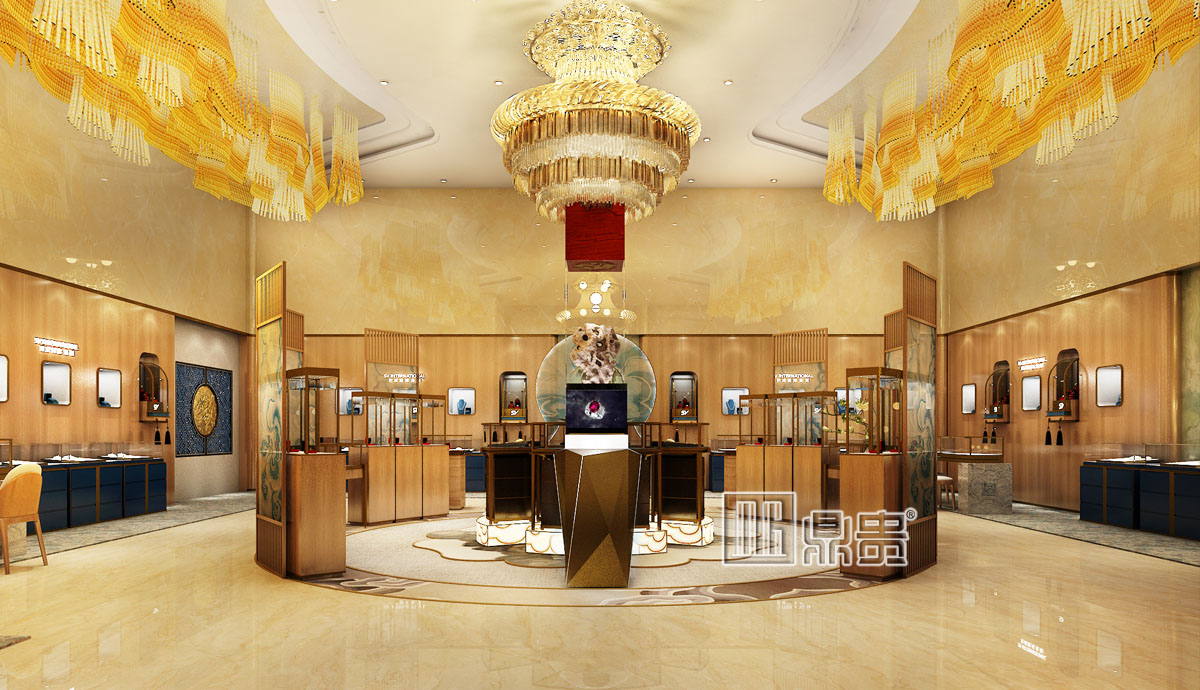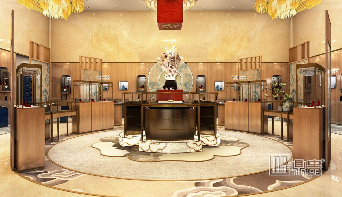 从门头开始,收拢,聚财的设计理念;从公司logo元素提取了一些精华,logo标识很好的突出了品牌,另外花纹也融入了 SV logo的元素;条纹夹丝玻璃增加神秘感。金色和灯光配合体现奢华高端;进门口正中央,整个围成一个圆形,用的是云和山水的元素托起展柜,进入其中的顾客仿佛置身在云山雨雾之中 ,得到尊贵的体验。八个方位都有展柜陈列 ,中心大型镇店之宝,灯光配合,陈列在其中的珠宝显得更繁华炫目,高雅脱俗。 周边的展柜陈列丰富?有高低错落之感;既有体验桌和陈列高柜;每一处细节都是结合企业和logo元素经过精心设计,让顾客有尊贵的体验;VIP大门上引用了龙的图腾,体现出中国的文化以及也是尊贵身份的象征;VIP入口借用古代龙的图腾,让VIP顾客能够真正感受身份的体现;古典现代风格的结合,体现出既富有文化和内涵,又具有创新和独特的超前意识